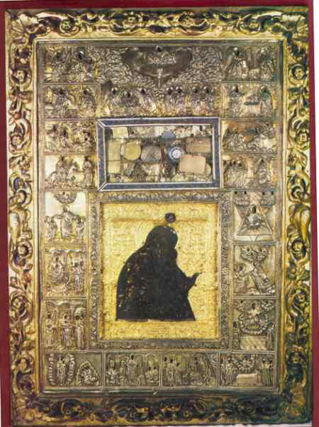Είναι κατασκευασμένη από κηρομαστίχα και με μύρο περιρρεομένη. Στο πίσω μέρος σε αργυρά πλάκα, είναι τετυπωμένος ό Αυτοκράτορας Αλέξιος ό Γ ό Κομνηνός και ό Όσιος Διονύσιος ό κτήτορας της Μονής και είναι γραμμένο το εξής: «Αυτή ή είκών ή Θαυματουργός εστί την οποίαν βάσταξέ Σέργιος ό Πατριάρχης περιερχόμενος τα τείχη της Κωνσταντινουπόλεως έδιωξε τους πολεμίους και την οποίαν ό Αυτοκράτωρ Αλέξιος ιδιοχείρως εδώρησε τω Άγίω Διονυσίω».